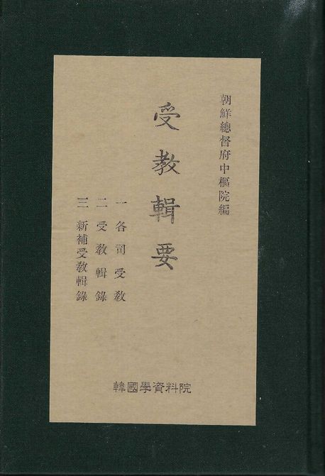 『受敎輯要』は朝鮮総督府中枢院が編纂した受教関連文書を整理・編集した文献であり、朝鮮時代後半から日帝強占期初までの公文書体系と統治手段として機能した受教の内容を一目でわかるようまとめた資料集。本書には、『各司修交』 『受教輯録』『新補受敎輯錄』など3つの主要受教文献が一緒に収録されており、これらを通じて朝鮮時代の官庁別行政体系と王命(または総督命令)の伝達方式、そして日帝強占期初期の制度変化までを把握できる。特に、政務、人事、軍事、司法、財政など各分野の統治文件が実名と共に記録されており、行政士・法制士・官僚制研究者にとって貴重な一次史料と評価される。中枢院が主導して編纂という点で、この文献は単なる古文書整理ではなく、『当時の植民地統治正当化のための記録化の試み』としても理解できる。
